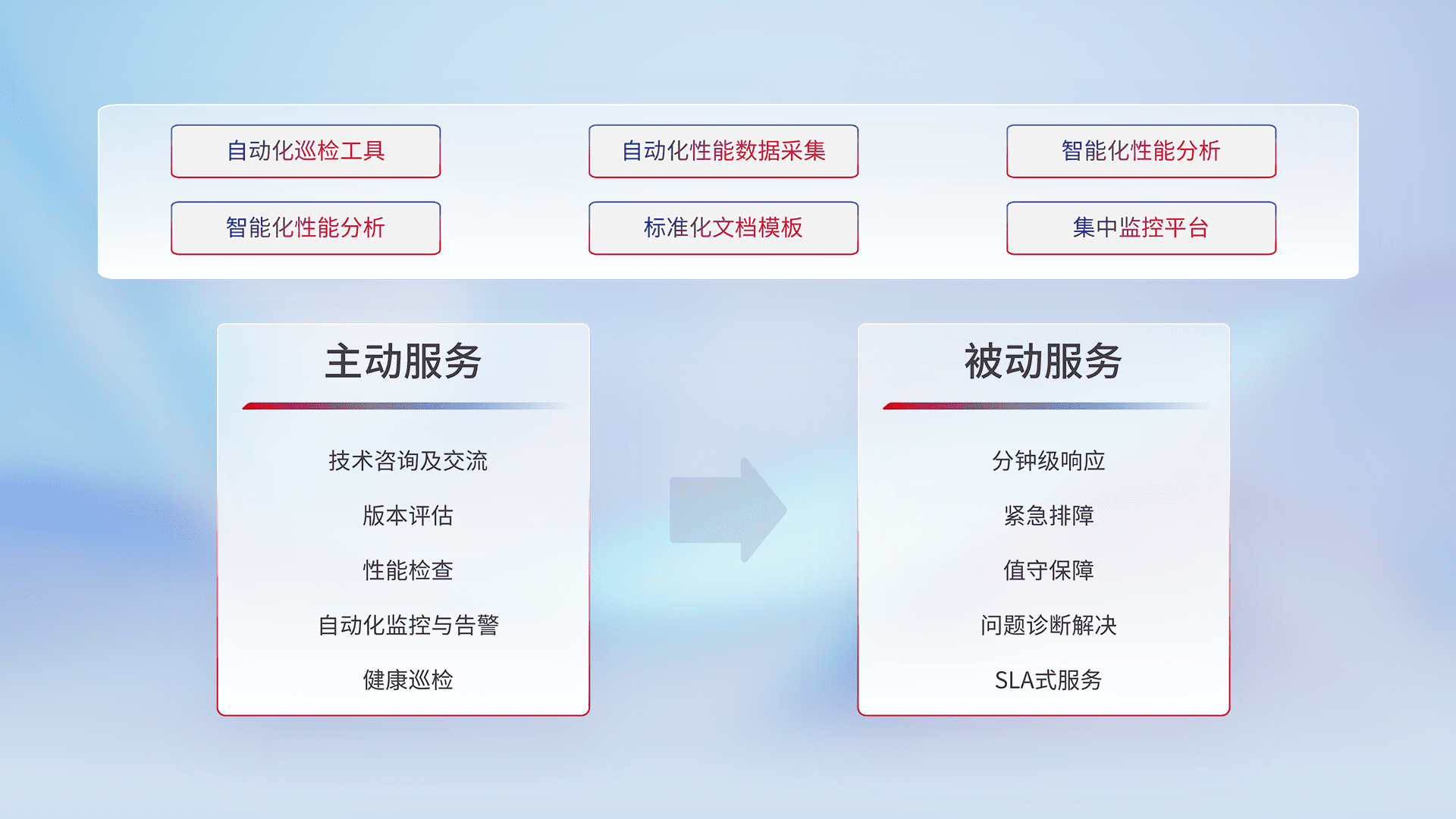 智能化工具和标准化文档,,,保障服务质量,,,提供主动服务(包含技术咨询、、、版本评估、、、性能检查、、自动化监控与告警、、健康巡检)和被动服务包含(分钟级响应、、、紧急排障、、、值守保障、、、问题诊断解决、、、、SLA服务)。。。。